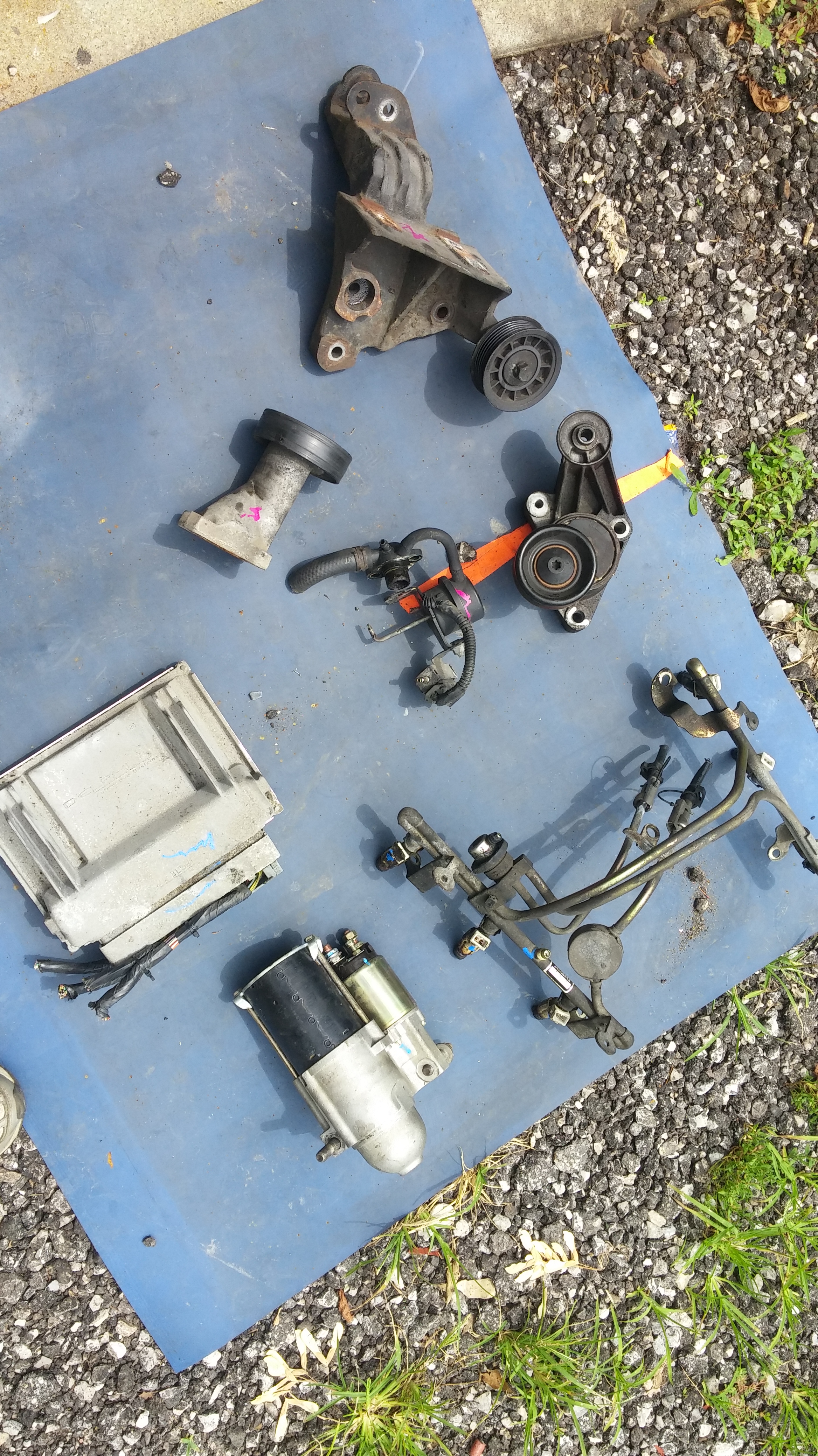 We finally took a long needed trip to the junkyard and collected a whole bunch of stuff. We got a supercharged fuel rail(which is bent in the picture), a bypass valve, idler and tension pulleys, a computer from a supercharged motor, a starter from a 2002 Camaro, and a oil filter adapter from the same Camaro. As I get closer to the end of this build I will show and tell exactly what parts I used and what, if any, modifications had to be done to them.
